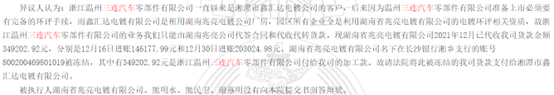 2022年3月的执行裁定书显示,异议人湘潭市鑫汇达电镀有限公司(下称“鑫汇达”)认为,三连零部件一直以来是鑫汇达的客户,后来因为三连零部件准备上市必须要有完备的环评手续,而鑫汇达是租用湖南省兆亮电镀有限公司(下称“湖南兆亮”)厂房,园区所有企业全是利用湖南兆亮的电镀环评相关资质,故三连零部件的业务,鑫汇达只能由湖南兆亮代签合同和代收代转货款。现湖南兆亮2021年12月已代收鑫汇达货款金额34.92万元。