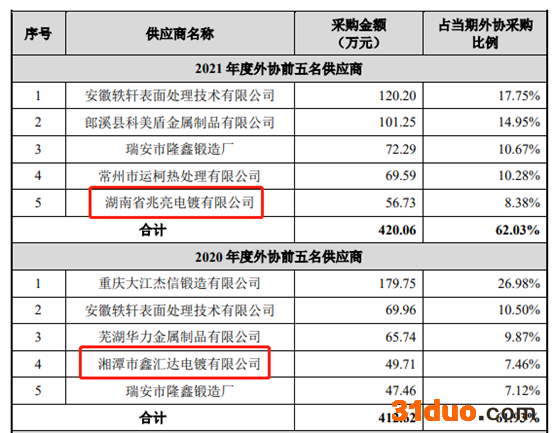 需要指出的是,三联锻造申报稿显示,鑫汇达为三联锻造2020年第4大外协供应商,相关采购金额为49.71万元,而2021年鑫汇达并没有成为三联锻造前五大外协供应商。湖南兆亮在2019年和2020年均非三联锻造前五大外协供应商,在2021年却成为三联锻造第五大外协供应商,相关采购金额为56.73万元。