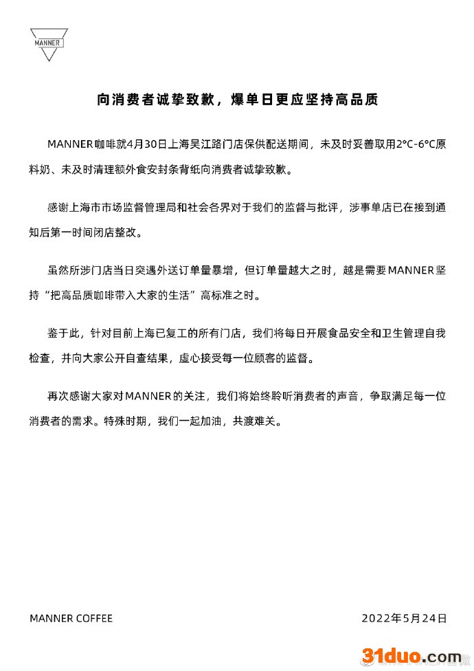 文章提到,MANNER咖啡就4月30日上海吴江路门店保供配送期间,未及时妥善取用2°C-6℃原料奶、未及时清理额外食安封条背纸向消费者诚挚致歉,涉事单店已在接到通知后第一时间闭店整改。