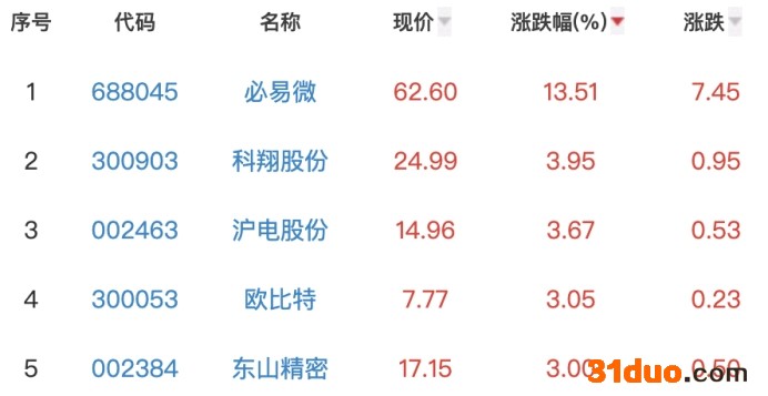 其中,必易微、科翔股份、沪电股份、欧比特和东山精密位列板块涨幅榜前五位,涨幅分别为13.51%、3.95%、3.67%、3.05%和3.00%。