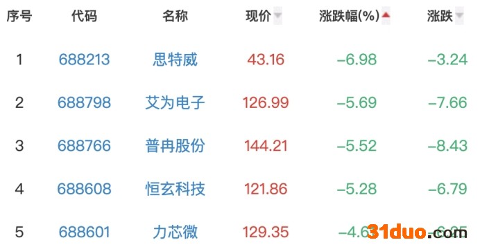 思特威、艾为电子、普冉股份、恒玄科技、力芯微位列板块涨幅榜后五位,涨幅分别为-6.98%、-5.69%、-5.52%、-5.28%和-4.61%。
