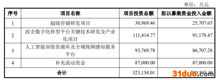 超级存储研发项目总投资3.10亿元,拟使用募集资金投入2.57亿元,用于办公场所投入、机房环境投入、硬件投入、软件投入以及研发投入等。项目由易华录直接负责实施。