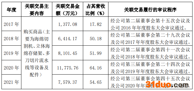 2017年-2020年,梦百合及子公司与恒康数控发生的关联交易的金额分别为1377.08万元、6414.17万元、8101.45万元、11775.76万元,占其营收的比例分别为17.82%、50.18%、51.99%、64.16%。