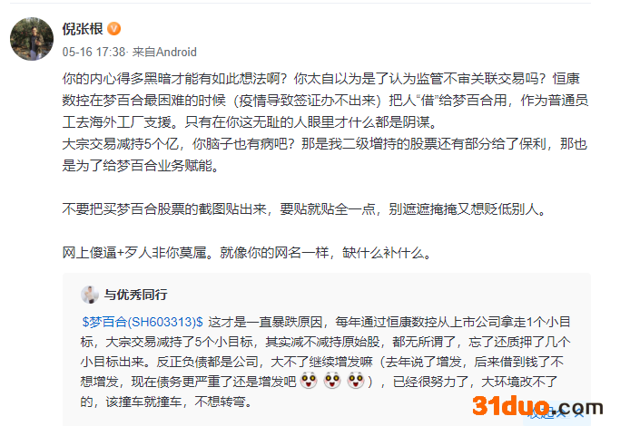 没想到该帖子引起了董事长倪张根的注意,倪张根公开回怼称,“你的内心得多黑暗才能有如此想法啊?你太自以为是了认为监管不审关联交易吗?恒康数控在梦百合最困难的时候(疫情导致签证办不出来)把人‘借’给梦百合用,作为普通员工去海外工厂支援。只有在你这无耻的人眼里才什么都是阴谋。”
