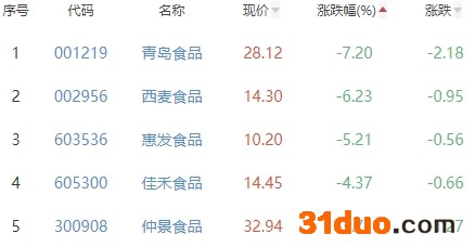 青岛食品、西麦食品、惠发食品、佳禾食品、仲景食品位列涨幅榜后五位,涨幅分别为-7.20%、-6.23%、-5.21%、-4.37%、-3.71%。
