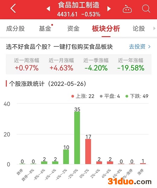 中国经济网北京5月26日讯 今日,食品加工制造板块整体跌幅0.53%,其中22只股票上涨,4只股票平盘,49只股票下跌。