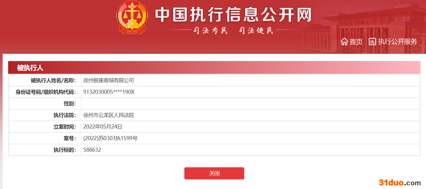 中国网财经5月26日讯 (记者 钟文鑫)据中国执行信息公开网,5月26日,徐州银座商城有限公司新增一条被执行人信息,执行标的金额为588632元,执行法院为徐州市云龙区人民法院。