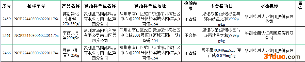 标称深圳盒马网络科技有限公司南山区第四分公司销售的鲜活净化小鲈鱼270-350g/条、宁德大黄鱼200g/条经抽检均不合格,不合格项目均为恩诺沙星(恩诺沙星与环丙沙星之和),承检机构均为华测检测认证集团股份有限公司。