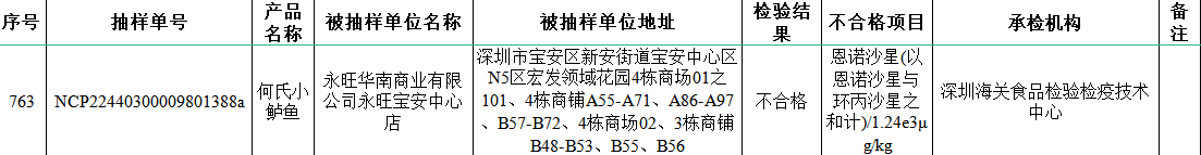 本次抽检发现,标称永旺华南商业有限公司永旺宝安中心店销售的何氏小鲈鱼经抽检不合格,不合格项目为恩诺沙星(以恩诺沙星与环丙沙星之和计),承检机构深圳海关食品检验检疫技术中心。