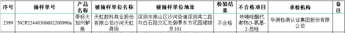 此外,标称天虹数科商业股份有限公司沙河天虹商场销售的带标大加州鲈鱼(条)经抽检不合格,不合格项目为呋喃唑酮代谢物(3-氨基-2-恶唑酮),承检机构华测检测认证集团股份有限公司。
