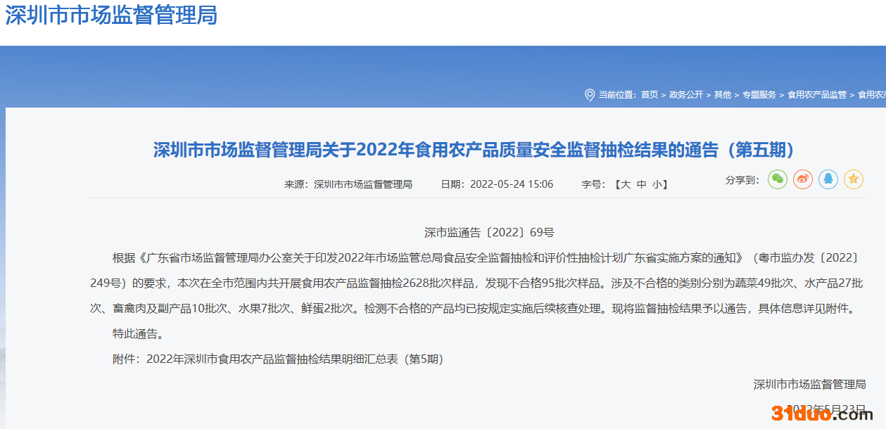 中国经济网北京5月26日讯 深圳市市场监督管理局网站日前公布的《关于2022年食用农产品质量安全监督抽检结果的通告》(第五期,深市监通告〔2022〕69号)显示,根据《广东省市场监督管理局办公室关于印发2022年市场监管总局食品安全监督抽检和评价性抽检计划广东省实施方案的通知》(粤市监办发〔2022〕249号)的要求,本次在全市范围内共开展食用农产品监督抽检2628批次样品,发现不合格95批次样品。涉及不合格的类别分别为蔬菜49批次、水产品27批次、畜禽肉及副产品10批次、水果7批次、鲜蛋2批次。检测不合格的产品均已按规定实施后续核查处理。