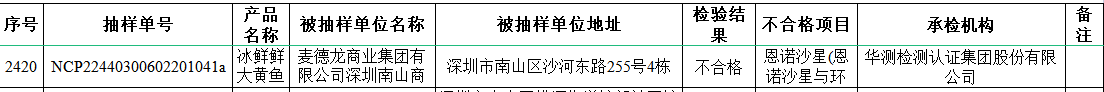 标称麦德龙商业集团有限公司深圳南山商场销售的冰鲜鲜大黄鱼400g经抽检不合格,不合格项目为恩诺沙星(恩诺沙星与环丙沙星之和),承检机构华测检测认证集团股份有限公司。