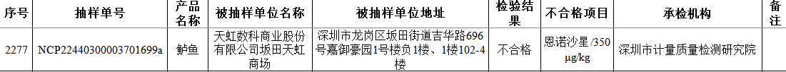标称天虹数科商业股份有限公司坂田天虹商场销售的鲈鱼经抽检不合格,不合格项目为恩诺沙星,承检机构深圳市计量质量检测研究院。