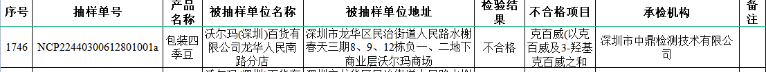 标称沃尔玛(深圳)百货有限公司龙华人民南路分店销售的包装四季豆经抽检不合格,不合格项目为克百威(以克百威及3-羟基克百威之和计)/0.054mg/kg,承检机构深圳市中鼎检测技术有限公司。