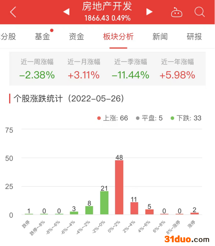 中国经济网北京5月26日讯 今日,房地产开发板块整体涨幅0.49%,其中66只股票上涨,5只股票平盘,33只股票下跌。