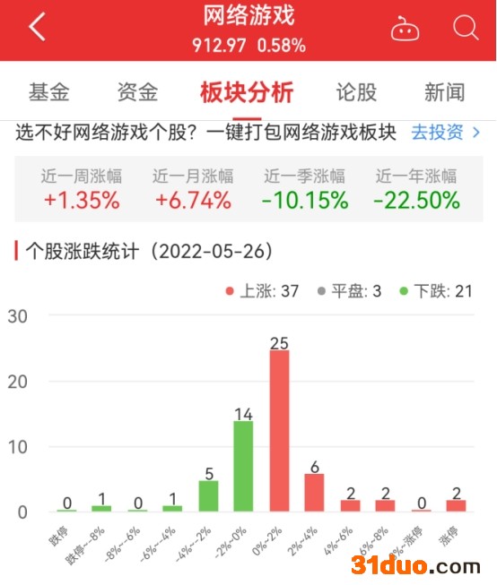 中国经济网北京5月26日讯 今日,网络游戏板块整体涨幅0.58%,其中37只股票上涨,3只股票平盘,21只股票下跌。