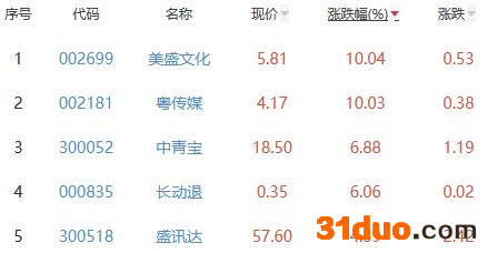 其中,美盛文化、粤传媒、中青宝、长动退、盛讯达位列板块涨幅前五位,涨幅分别为10.04%、10.03%、6.88%、6.06%、4.39%。