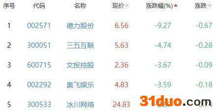 德力股份、三五互联、文投控股、奥飞娱乐、冰川网络位列涨幅榜后五位,涨幅分别为-9.27%、-4.74%、-3.67%、-3.59%、-2.89%。