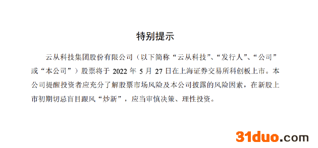 新浪科技讯 5月25日晚间消息,人工智能企业云从科技今日发布《首次公开发行股票科创板上市公告书》(《简称:公告》)。据公告显示,云从科技将于5月27日在上海证券交易所科创板上市,首次公开发行价每股15.37元,对应的发行人2021年摊薄后静态市销率为10.58倍,低于同行业可比公司2021年静态市销率平均水平。