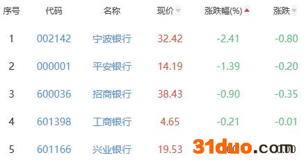 宁波银行、平安银行、招商银行、工商银行、兴业银行位列涨幅榜后五位,涨幅分别为-2.41%、-1.39%、-0.90%、-0.21%、0.00%。