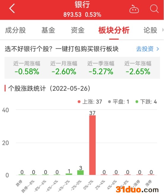中国经济网北京5月26日讯 今日,银行板块整体涨幅0.53%,其中37只股票上涨,1只股票平盘,4只股票下跌。