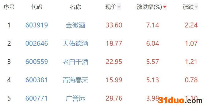 其中,金徽酒、天佑德酒、老白干酒、青海春天、广誉远位列板块涨幅榜前五位,涨幅分别为7.14%、6.04%、5.57%、5.13%、3.98%。