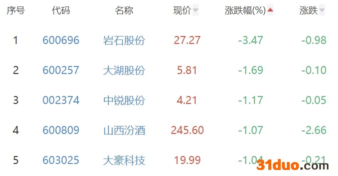 岩石股份、大湖股份、中锐股份、山西汾酒、大豪科技位列板块涨幅榜后五位,涨幅分别为-3.47%、-1.69%、-1.17%、-1.07%、-1.04%。