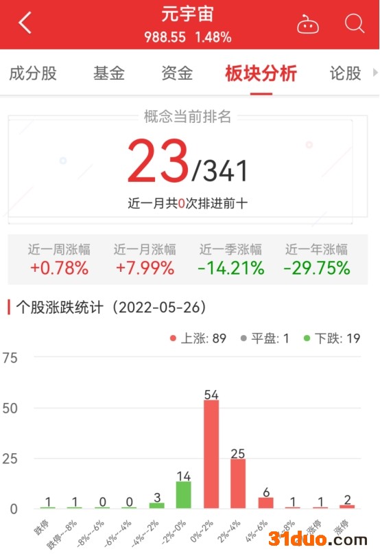 中国经济网北京5月26日讯 今日,元宇宙板块整体涨幅1.48%,其中89只股票上涨,1只股票平盘,19只股票下跌。