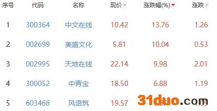 其中,中文在线、美盛文化、天地在线、中青宝、风语筑位列板块涨幅前五位,涨幅分别为13.76%、10.04%、9.98%、6.88%、5.67%。