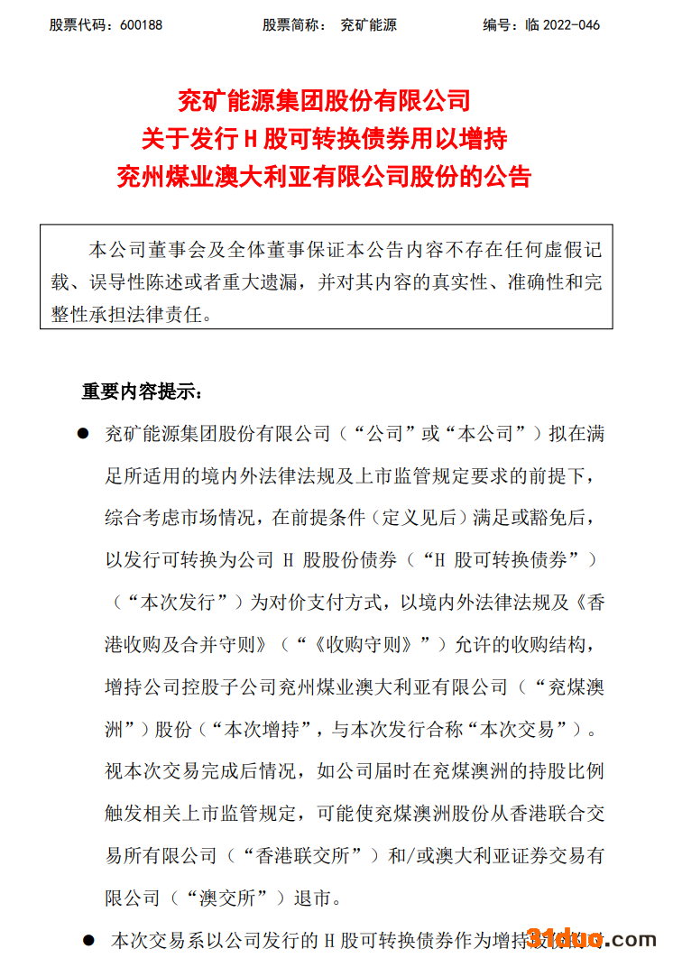 根据公告,兖矿能源计划发行H股可转换债券本金金额约17.94亿美元,用以增持兖州煤业澳大利亚有限公司股份。