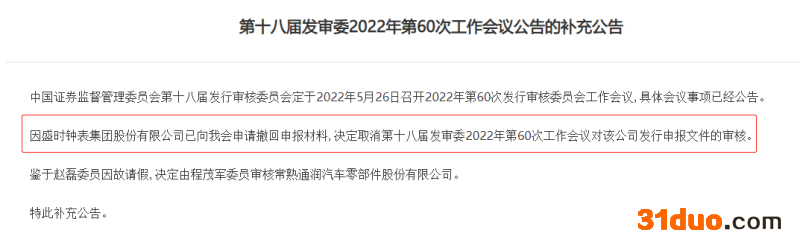 盛时钟表集团股份有限公司(以下简称“盛时股份”)原计划于5月26日上会。不过根据证监会5月25日公告,因盛时股份申请撤回申报材料,决定取消第十八届发审委2022年第60次工作会议对该公司发行申报文件的审核。