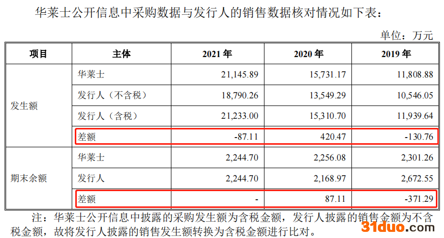 二轮问询回复显示,报告期内,华莱士公开信息中采购数据发生额与南王科技销售数据发生额差额分别为-130.76万元、420.47万元和-87.11万元;华莱士公开信息中采购数据期末余额与公司销售数据期末余额差额分别为-371.29万元、87.11万元和0元。