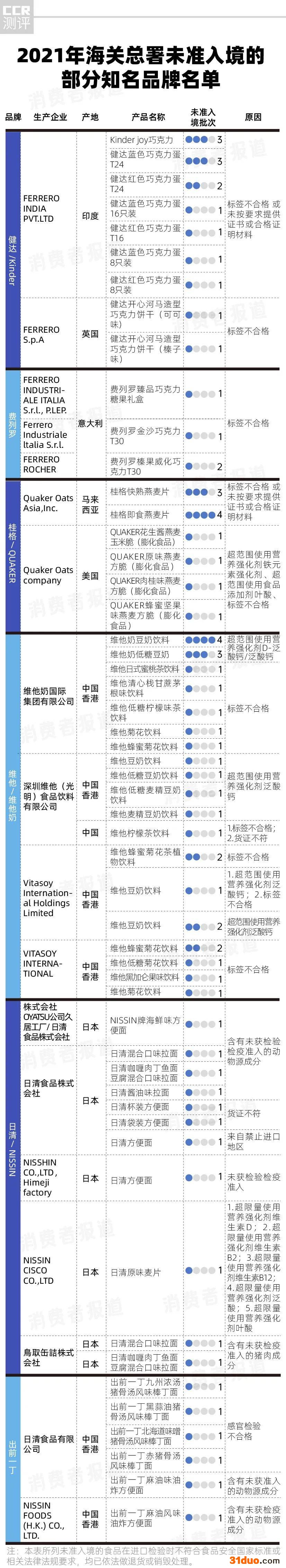 此外,其他知名品牌如奔富、德亚、格力高、不二家、乐天、美心、统一、中原G7、三得利等个别批次产品也有未准入境记录,不再一一赘述。