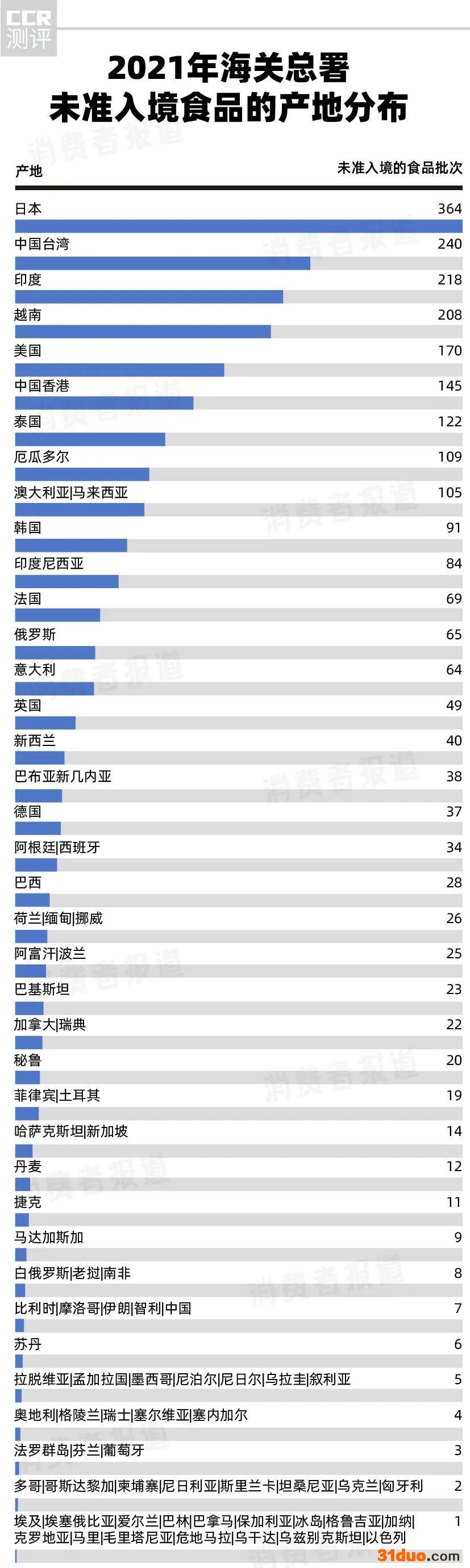 从产地看,抽检发现未准入境的食品来自86个国家或地区,当中以日本检出的“问题食品”最多,多达364批次,其次是中国台湾、印度、越南等。