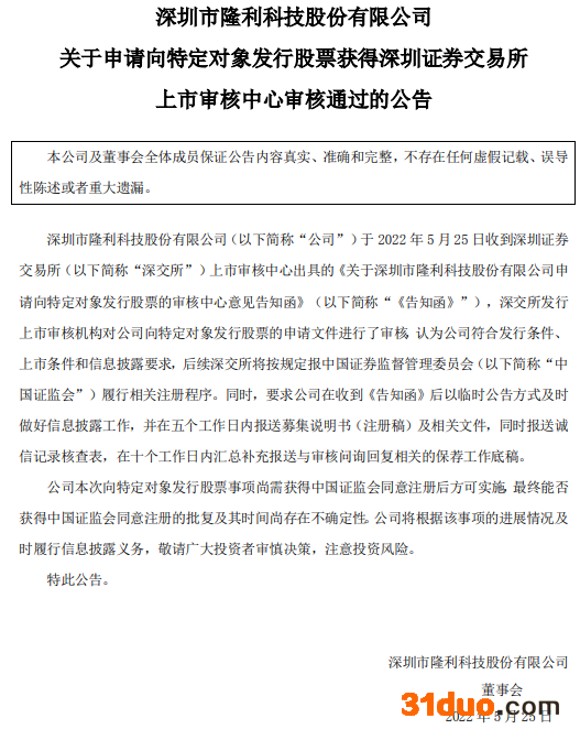 中国经济网北京5月26日讯 隆利科技(300752.SZ)昨日晚间发布公告,公司申请向特定对象发行股票获得深圳证券交易所上市审核中心审核通过。