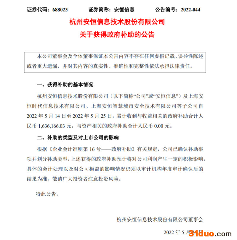 蓝鲸TMT频道5月26日讯,今日,杭州安恒信息技术股份有限公司发布关于获得政府补助的公告。公告指出,杭州安恒信息技术股份有限公司(以下简称“安恒信息”)及上海安恒时代信息技术有限公司、上海安恒智慧城市安全技术有限公司等子公司自2022年5月14日至2022年5月25日,累计收到与收益相关的政府补助合计人民币164万元,与资产相关的政府补助合计人民币0元。
