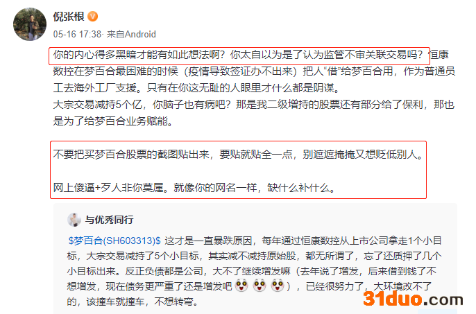 该网友的此番言论或许是戳到了公司的痛点,梦百合董事长倪张根看到后直接暴跳如雷,回怼该网友称,你的内心得多黑暗才能有如此想法啊?你太自以为是了认为监管不审关联交易吗?或许是“情到深处”,倪张根甚至还破口大骂。
