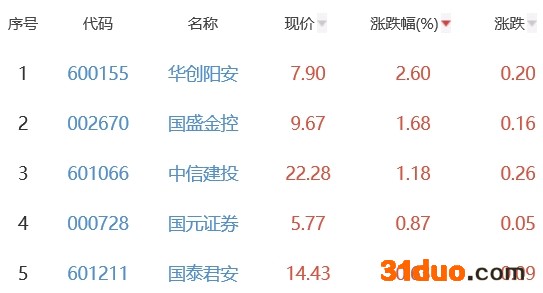 其中,华创阳安、国盛金控、中信建投、国元证券、国泰君安位列板块涨幅榜前五位,涨幅分别为2.60%、1.68%、1.18%、0.87%和0.63%。