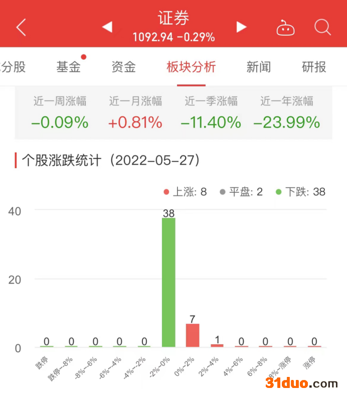 中国经济网北京5月27日讯 今日,证券板块整体跌幅0.29%,其中8只股票上涨,2只股票平盘,38只股票下跌。