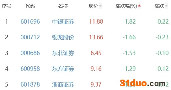 中银证券、锦龙股份、东北证券、东方证券和浙商证券位列板块涨幅榜后五位,涨幅分别为-1.82%、-1.66%、-1.53%、-1.29%和-1.26%。