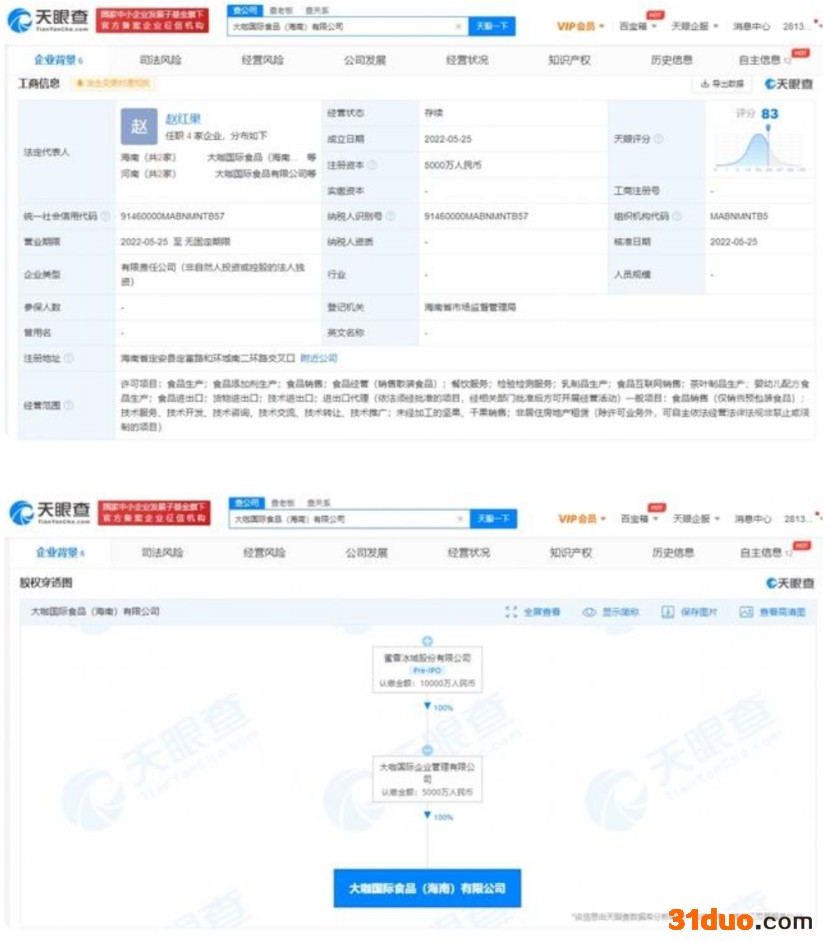 天眼查App显示,近日,大咖国际食品(海南)有限公司成立,注册资本5000万人民币,法定代表人为赵红果,经营范围含食品生产、销售;餐饮服务;乳制品生产;婴幼儿配方食品生产等。股权穿透图显示,该公司由蜜雪冰城股份有限公司间接全资持股。