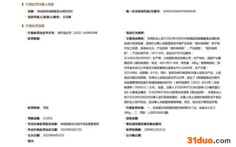 而据国家企业信用信息公示系统显示,因使用过期原料,近日广西桂林市恭城县恭城镇蜜雪冰城奶茶店被罚款2000元,并没收涉事产品。这不是蜜雪冰城第一次被罚。去年以来,蜜雪冰城便频频曝出质量问题。如2021年7月,陕西西安袁女士在蜜雪冰城购买的柠檬水里喝出臭虫;2021年8月,福建福州抽检出蜜雪冰城门店存有发霉柠檬,调制糖浆与奶制品无密封冷藏保存;同年8月,由于使用过期食品原料,河南省5家蜜雪冰城门店被责令停业整改,9家被处以行政处罚;2021年9月,蜜雪冰城门店因生产经营条件发生变化,未按规定处理被通报,因食品经营条件不符合食品安全要求、安排未取得健康证明的人员从事接触直接入口食品的工作被立案查处。
