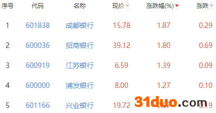 其中,成都银行、招商银行、江苏银行、浦发银行、兴业银行位列板块涨幅前五位,涨幅分别为1.87%、1.80%、1.39%、1.27%、0.97%。