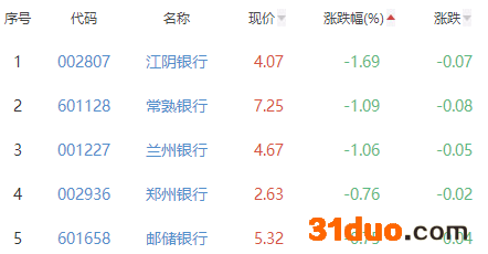 江阴银行、常熟银行、兰州银行、郑州银行、邮储银行位列涨幅榜后五位,涨幅分别为-1.69%、-1.09%、-1.06%、-0.76%、-0.75%。
