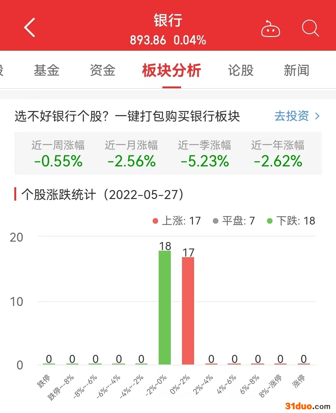 中国经济网北京5月27日讯 今日,银行板块整体涨幅0.04%,其中17只股票上涨,7只股票平盘,18只股票下跌。