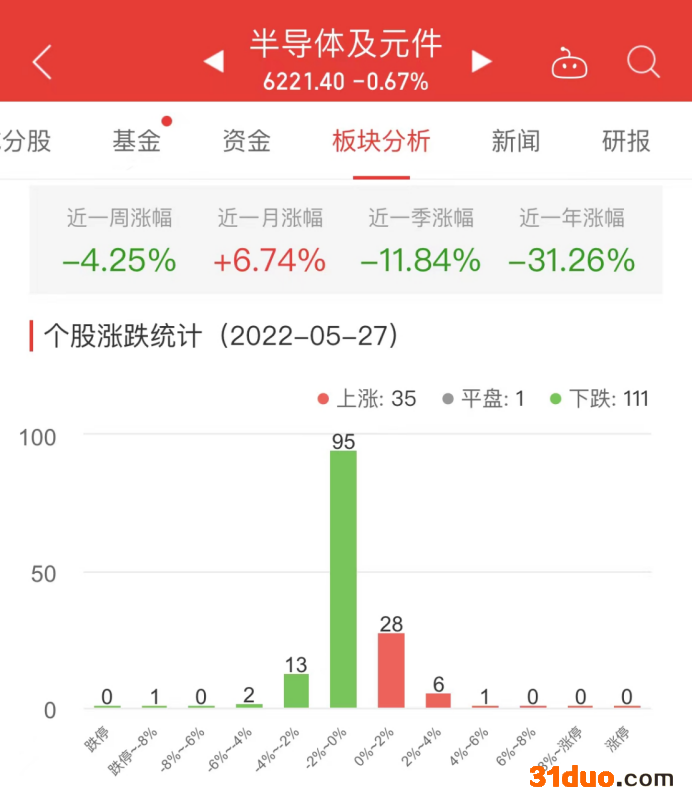 中国经济网北京5月27日讯 今日,半导体及元件板块整体跌幅0.67%,其中35只股票上涨,1只股票平盘,111只股票下跌。