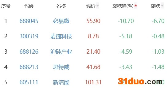 必易微、麦捷科技、沪硅产业、思特威、新洁能位列板块涨幅榜后五位,涨幅分别为-10.70%、-5.18%、-4.59%、-3.43%和-2.88%。