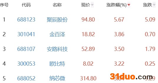 其中,聚辰股份、金百泽、安路科技、欧比特和纳芯微位列板块涨幅榜前五位,涨幅分别为5.67%、3.86%、3.50%、3.22%和3.04%。