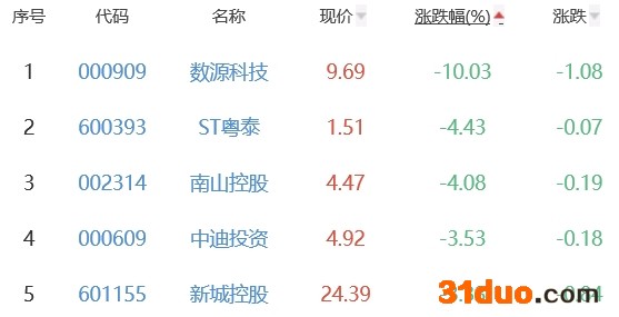 数源科技、ST粤泰、南山控股、中迪投资、新城控股位列板块涨幅榜后五位,涨幅分别为-10.03%、-4.43%、-4.08%、-3.53%和-3.33%。