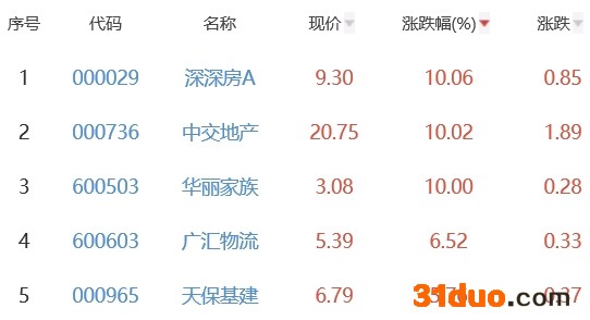 其中,深深房A、中交地产、华丽家族、广汇物流和天保基建位列板块涨幅榜前五位,涨幅分别为10.06%、10.02%、10.00%、6.52%和5.76%。